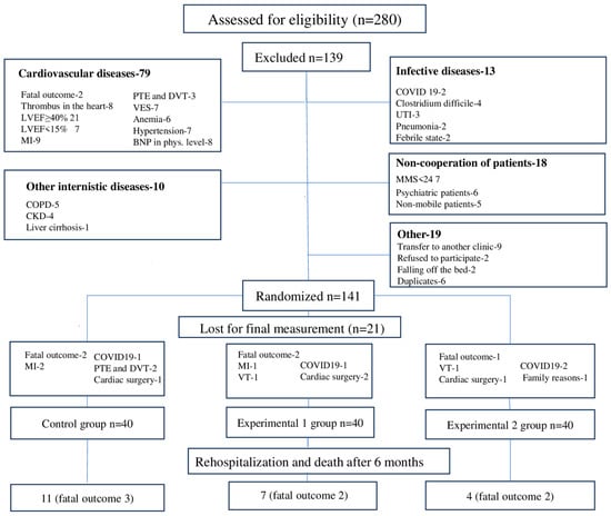Flowchart of the study. BNP—brain natriuretic peptide, CKD—chronic kidney disease, COPD—chronic obstructive pulmonary disease, DVT—deep vein thrombosis, LVEF—left ventricle ejection fraction, MI—myocardial infarction, MMS—mini-mental score, PTE—pulmonary thromboembolism, UTI—urinary tract infections, VES—ventricular extrasystoles, VT—ventricular tachycardia.