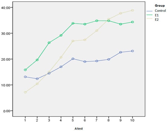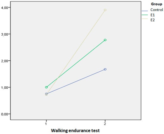 The SPANOVA test showed that the combination of KTH and AP in the E2 group improved functionality at discharge the most, compared to the other two groups, as assessed by the A test (Wilks’ lambda = 0.035, F = 4.840, p < 0.001, η2 = 0.813), Figure 2. Also, KTH and AP combined resulted in a significantly greater improvement in the walking endurance test compared to the other two groups (Wilks’ lambda = 0.496, F = 59.50, p < 0.001, η2 = 0.504), Figure 3. All squared eta (η2) values are high, indicating that the kind of therapy (KTH and AP) has a strong combined effect on the change in results when comparing the values at admission and discharge.