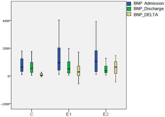 In the E2 group, blood concentrations of BNP decreased more pronouncedly from admission to discharge, compared to the E1 and C groups (64.1%, p < 0.001; 46.0%, p < 0.001; 12.9%, p = 0.001; respectively). The groups had the same average BNP upon admission. There were variances in the BNP delta discrepancy in measurements between C vs. E1 (p = 0.001) and C vs. E2 (p < 0.001). There was no difference in the BNP delta discrepancy between the two experimental groups (Figure 4).