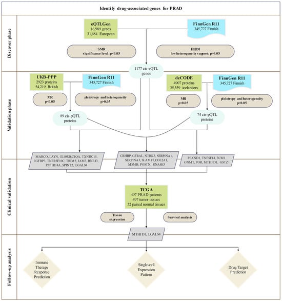 The following supporting information can be downloaded at: https://www.mdpi.com/article/10.3390/biomedicines13010185/s1. Table S1. The positive genetic variations of eQTLs utilized in the discovery phase; Table S2. The positive UKB-PPP pQTLs utilized in the validation phase; Table S3. The heterogeneity and pleiotropy analysis in the significance results of MR analysis of UKB-PPP cis-pQTLs and PRAD; Table S4. The instrumental variables in MR analysis of UKB-PPP cis-pQTLs on PRAD; Table S5. The positive deCODE pQTLs utilized in the validation phase; Table S6. The heterogeneity and pleiotropy analysis in the significance results of MR analysis of deCODE cis-pQTLs and PRAD; Table S7. The instrumental variables in MR analysis of deCODE cis-pQTLs on PRAD; Table S8. The positive UKB-PPP and deCODE pQTLs utilized in the validation phase.