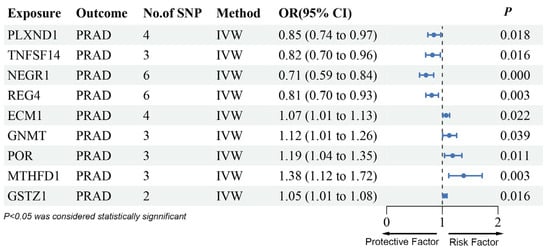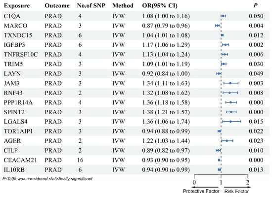 Forest plots illustrating the results of the validation stage for 17 essential genes in UK Biobank Proteome Plasma Proteins (UKB-PPP). OR: odds ratio, 95% CI: 95% confidence intervals; PRAD: prostate adenocarcinoma, SNP: single-nucleotide polymorphisms, IVW: inverse-variance weighted.