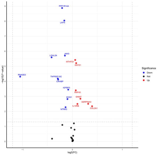 The expression of 30 essential genes between PRAD and paired-normal tissues. The volcano plot illustrates the differential gene expression analysis of 52 paired prostate cancer tissues compared to adjacent non-cancerous tissues. The x-axis represents the log2 fold change (log2FC) in gene expression, where positive values indicate upregulated genes in cancer tissues, and negative values indicate downregulated genes. The y-axis shows the −log10 (p-value), indicating the statistical significance of the differential expression. Significant genes are highlighted based on their fold change and p-value thresholds. Genes upregulated in prostate cancer are marked in red, while downregulated genes are marked in blue. Non-significant genes are displayed in black.