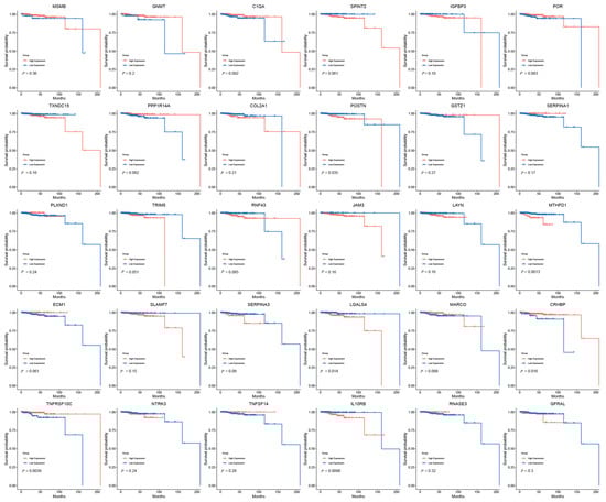 The survival analysis of 30 essential genes in PRAD patients. The KM survival curve distribution of different sample groups in the TCGA dataset, with log-rank tests conducted between groups.
