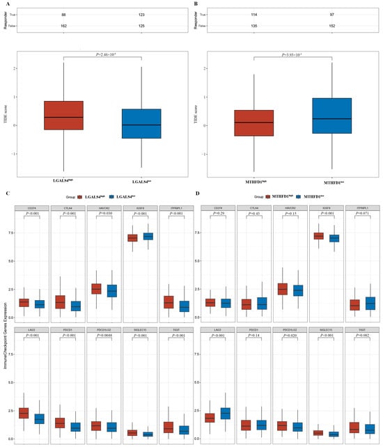The potential immune therapy response prediction of LGALS4 and MTHFD1: (A) TIDE scores of immune response in LGALS4-high and LGALS4-low groups in the prediction results; (B) TIDE scores of immune response in MTHFD1-high and MTHFD1-low groups in the prediction results; (C) the distribution of immune checkpoint gene expression in LGALS4-high and LGALS4-low groups; and (D) the distribution of immune checkpoint gene expression in MTHFD1-high and MTHFD1-low groups. The significance was tested with the Wilcoxon test.