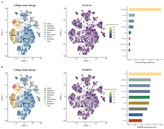 Single-cell RNA sequencing (scRNA-seq) data from the GSE176031 dataset further illuminated these distinct expression patterns within the tumor microenvironment. LGALS4 demonstrates significantly elevated expression levels in malignant cells compared to other cell populations such as fibroblasts, T regulatory (Treg) cells, and epithelial cells (Figure 8A). The preferential expression in malignant cells suggests that LGALS4 may play a critical role in tumorigenesis and cancer cell-specific metabolic or signaling pathways. In contrast, the expression of MTHFD1 is more heterogeneous, with notable enrichment in mast cells, malignant cells, and macrophage/monocyte populations. This suggests the multifaceted role of MTHFD1 in cancer cell metabolism and the tumor microenvironment (Figure 8B).