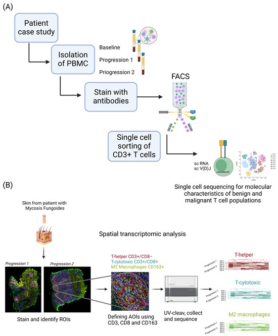 The BIO-MUSE study is a prospective translational study registered with clinicalTrials.gov (NCT4904146). The clinical study was approved by the Swedish Ethical Review Authority (2019-05130). Informed consent was obtained from all patients before inclusion to the clinical trial. Inclusion criteria for participation in the study are age between 18 and 100 years, confirmed MF or SS diagnosis with stage IA-IVB, and World Health Organization performance status 0–3. The first patient was enrolled in April 2021 and the inclusion is ongoing, with 19 patients enrolled at the end of September 2024. Further details about the BIO-MUSE study design are available in the published study protocol [18]. The human peripheral blood samples used in this study were derived from one patient. Peripheral blood samples were collected at three different time points. Baseline corresponded to the peripheral blood sample collected and processed at the time of inclusion of the patient to the clinical trial. Progression 1 corresponded to the sample collected two months after initial patient inclusion when primary disease progression was confirmed. Progression 2 corresponded to the sample collected seven months upon initial patient inclusion when secondary disease progression was confirmed. Skin biopsies analyzed in this study were derived from the same time points, at progression 1 and progression 2. Clinical information on the case study patient is available in Table 1 and Supplementary Materials Table S1. An overview of the study is shown in Figure 1.