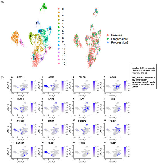 At least 10,000 cells were sorted, and went through preparatory steps, resulting in the sequencing of at least 1500 single cells from each time point. After QC, the number of cells evaluable varied from >5000 for the baseline sample, while ~1300 and ~500 cells were evaluable from the time of progression 1 and progression 2, respectively (Supplementary Materials Table S3). Using unsupervised clustering, with a resolution of 0.5 using the FindClusters function, 16 clusters could be identified and were visualized using uniform manifold approximation and projection (UMAP). The integrated UMAP showing cells from all timepoints is shown in Figure 2A, while the integrated UMAPs visualizing the individual time points are shown in Supplementary Materials Figure S3A. The top 25 differentially expressed genes (DEGs) for each cluster are listed in Supplementary Materials Table S5 and one of the top features for each cluster is visualized in Figure 2B, exemplifying the main biological difference between the identified clusters. Many markers are associated with important T-cell function, including expression of granzymes such as GZMB and K (cluster 1 and 3), killer lectin receptors C4, B1, and C1 (cluster 4, 11, and 13), the interleukin-7 receptor (cluster 6), and chemokine receptor 7 (cluster 15). Of note, other key differentially expressed genes have previously been associated with CTCL including LAIR2 [28] for cluster 5 and FGFBP2 [29] for cluster 10, emphasizing the biological relevance of the key DEGs.