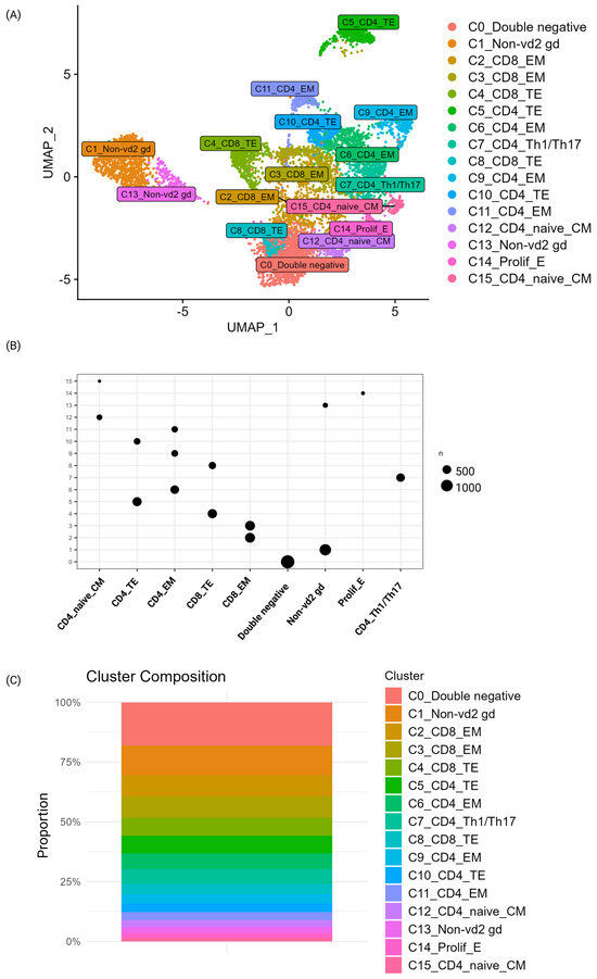 Cell type identification was performed using a semi-automated method where the SingleR workflow was applied, and manual validation of canonical phenotypic markers and of top DEGs (Supplementary Materials Table S5) was used to verify and complement the cell type identification for each cluster. The relative expression of the phenotypic markers used for verification are available in Supplementary Materials Figure S3B. The sixteen clusters were annotated, resulting in the identification of nine different cell types (Table 2 and Figure 3A). The number of cells in each of the clusters is shown across the defined cell types in Figure 3B and in Supplementary Materials Table S6. Both CD4- and CD8-positive T-cell populations were identified. Among CD4-positive cells, four subsets, including terminal effector, effector memory, Th1/Th17, and naïve/central memory T-cells, were identified. Among CD8-positive cells, two populations, including effector memory T-cells and terminal effector T-cells, were identified. Additional identified cell clusters included double-negative T-cells, non-vd2 gd, and proliferating effector T-cells. Surprisingly, no regulatory T-cell cluster was identified. The relative proportion of each cluster for the complete dataset with all three time points included is shown in Figure 3C and Supplementary Materials Table S6. The relative proportion of cells varied over time for many of the identified cell types, including proliferating effector T-cells that had more than 5× as many cells at progression 2 compared to earlier time points. Non-vd2 gd showed the opposite trend, with approximately one-third of the cell frequency at progression 2 compared to earlier time points. Visualizations of the relative proportions of each cell type at the three different timepoints are shown in Supplementary Materials Figure S4.