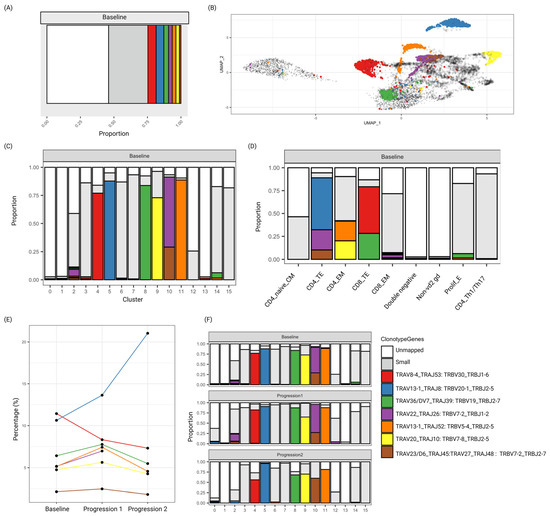 TCR sequencing reveals CD4+ and CD8+ expanded clones. The colors represent the clonotype genes indicated at the lower right panel. (A) The relative proportion of the top seven clonotypes among total number of cells at baseline displayed in one color each. Clonotypes only detected at a low proportion are jointly displayed in grey, and unmapped cells are displayed in white. (B) Clonotype identity of each cell in the integrated UMAP plot. The small black dots represent the unmapped cells with no T-cell receptor α/β chain. (C) The relative proportion of each of the top seven clonotypes across the clusters at baseline. (D) The relative proportion of each of the top seven clonotypes across the different cell types at baseline. (E) The percentage of TCR sequenced cells of each of the top seven clonotypes, visualized across the three time points (baseline, progression 1, and progression 2). (F) The relative proportion of the top seven clonotypes in each cluster, visualized across the three time points (baseline, progression 1, and progression 2).