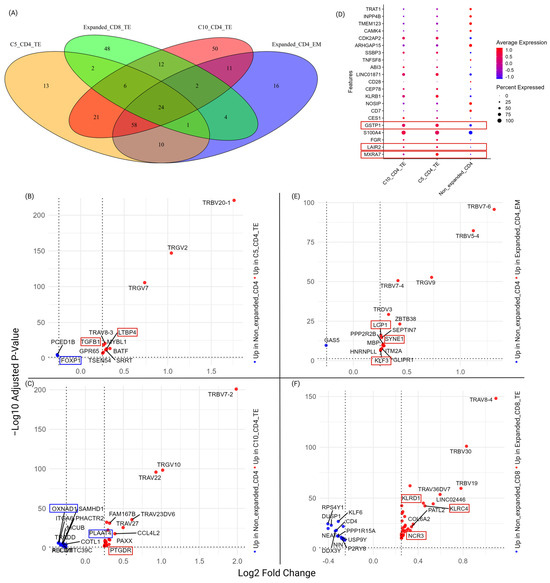 Differentially regulated genes (DEGs) at baseline. DEGs associated with different expanded compared to non-expanded populations were determined. (A) Venn diagram of unique and common genes across C5_CD4_TE, C10_CD4_TE, expanded CD4_EM, and expanded CD8_TE. (B) Volcano plot of the 13 unique DEGs associated with the progression-related C5_CD4_TE. (C) Volcano plot of the 50 unique DEGs associated with malignant population C10_CD4_TE. (D). Dot plot of the 21 common genes among C5_CD4_TE and C10_CD4_TE but that differ compared to non-expanded CD4 cells. Red boxes indicate key genes. (E) Volcano plot of the 16 unique DEGs associated with expanded CD4_EM cells. (F) Volcano plot of the 48 unique DEGs associated with expanded CD8_TE cells. Genes marked with red and blue boxes indicate important features for each expanded T-cell population.