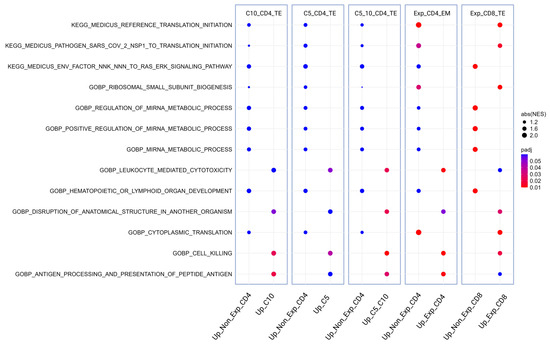 Pathway analysis comparing expanded peripheral T-cell populations compared to non-expanded cells. The top five identified pathways in each comparison driven by differentially regulated genes; the top significant (adjusted p-value < 0.05) pathways are ranked based on absolute normalized enrichment score (abs(NES)). The following comparisons were made: C5_C10, Exp_CD4 (C9 and C11), C10, and C5 were each compared to non-expanded CD4 cells (C6, C7, C12, C15). Exp_CD8 (C4 and C8) were compared to non-expanded CD8 cells (C2 and C3).