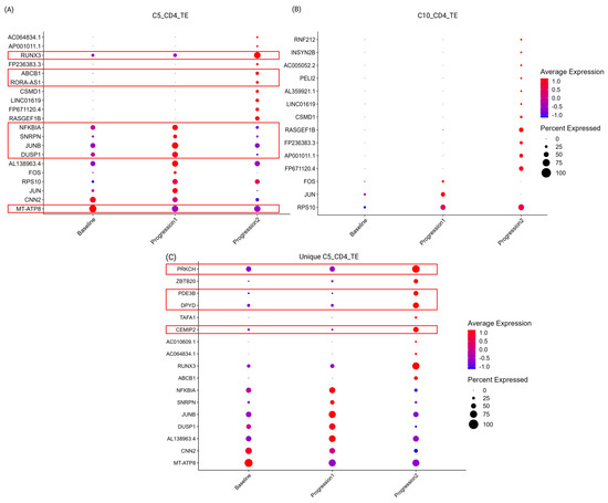 To understand the molecular mechanisms associated with the disease progression, the malignant C5 and C10 CD4_TE cells were followed over time. DEGs were identified, and the most significant (based on adjusted p-values) genes are shown in Figure 7A (C5), Figure 7B (C10), and Supplementary Materials Tables S13 and S14. At baseline, MT-ATP8 had the relative highest expression in the C5_CD4_TE cells, while genes associated with aggressiveness of disease such as NFKBIA, JUNB, DUSP1, FOS, JUN, and RPS10 were increased at progression 1. At progression 2, additional up-regulated genes included the transcription factor RUNX3 along with genes associated with resistance to treatment and/or proliferation such as ABCB1 and RORA-AS1 (see Figure 7A and Supplementary Materials Table S13). Some genes were identically regulated in C10, including the overexpression of RASGEF1B at progression 2. To complement the analysis, unique features, observed only in C5 and not significantly differentially regulated in C10 compared to non-expanded clones, were identified (Figure 7C and Supplementary Materials Table S15). In addition to the previously mentioned RUNX3 and ABCB1, unique features included genes associated with cellular functions such as proliferation and chemoresistance by kinase c eta type (PRKCH, [35]), regulation of angiogenesis by phosphodiesterase 3B (PDE3B, [36]), degradation of cytotoxic compounds, dihydropyrimidindehydrogenas (DPYD, [37]), and motility by cell migration inducing hyaluronidase 2 (CEMIP2). To our knowledge, none of the genes have been described to play a role in the progression of MF previously. One of the genes, RUNX3 has been associated with CD8 lineage and tumor suppression in MF, but somewhat unexpectedly, here, the expression was highly up-regulated at progression 2. However, recent reports show that RUNX3 may also play a role in aggressiveness of disease in solid tumors [38,39].