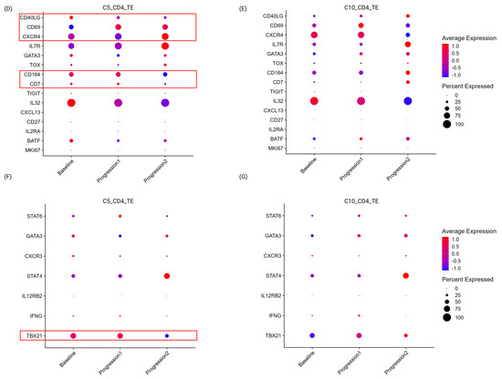 Differentially regulated genes (DEGs), associated with progression of MF. Key genes associated with C5_CD4_TE are marked with red boxes. (A) Dot plot of top 10 DEGs associated with progression in C5_ CD4_TE. (B) Dot plot of top 10 DEGs associated with progression in C10_ CD4_TE. (C) Top 10 unique genes associated with progression in C5_ CD4_TE. Targeted analysis of CTCL-related markers in (D) C5_ CD4_TE and (E) C10_CD4_TE. Targeted analysis of Th1- and Th2-related immune markers in (F) C5_ CD4_TE and (G) C10_CD4_TE.