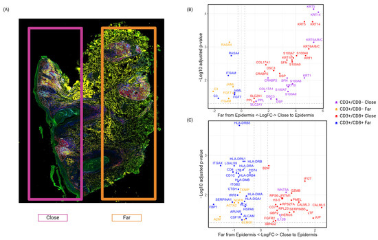 We hypothesized that the comparison of transcriptional profiles in different spatial localizations (see Figure 8A) would reveal intra-tumor variation. DEGs up-regulated in both CD4 (T-helper cells (CD3+/CD8−)) and CD8 (T-cytotoxic cells (CD3+/CD8+)) T-cell segments in regions close or distal to the epidermis, in skin biopsy from progression 1, were identified (Figure 8B, Supplementary Materials Table S18). No DEGs were found comparing spatial localizations close or distant from epidermis among CD163+ segments. T-cell-related DEGs with higher expression values close to the epidermis included a wide range of structural-related genes such as keratin, collagens, desmoplakins, and adhesion-related molecules such as desmocollin. S100 family proteins involved in cell cycle progression/differentiation and specific genes associated with invasion and metastasis (BRABP21) were also up-regulated. DEGs with higher expression values more distant from the epidermis included integrins (ITGAM1), adhesion-related molecules (JAML1), and growth factors (FGF71).
