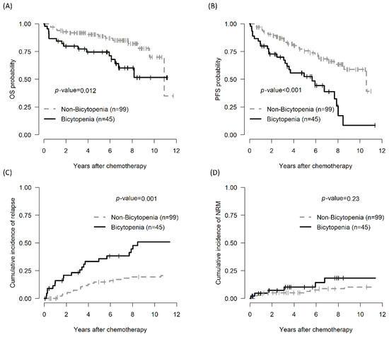 The 5-year OS of the bicytopenia and non-bicytopenia groups was 74.6% (95% CI, 62.6–88.9) and 88.8% (95% CI, 82.4–95.7, p = 0.012), respectively. The 5-year PFS in the bicytopenia and non-bicytopenia was 52.5% and 75.6%, respectively (p < 0.001). The 5-year CIR in the bicytopenia and non-bicytopenia groups was 38.5% and 11.1%, respectively (p = 0.001). The 5-year NRM did not significantly differ between the two groups (Figure 1 and Table 2).