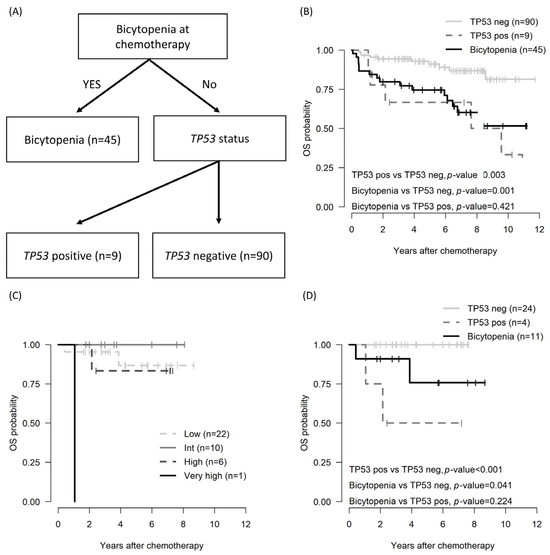 Because the β2 microglobulin level (n = 102) and IGHV status (n = 46) were evaluated in the subgroup, a survival decision tree was employed for risk stratification. In analyzing the OS and PFS using the survival decision tree, the bicytopenia group and the non-bicytopenia group were divided at the first layer. Moreover, TP53 status, both positive and negative, influenced the tree split (Figure 2A). Bicytopenia, combined with TP53 positivity, was associated with inferior OS (Figure 2B).