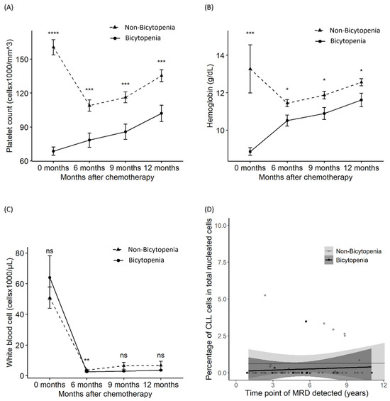 Differences in platelet count, hemoglobin level, white blood cell count, and MRD between the bicytopenia and non-bicytopenia groups. After chemotherapy initiation, comparisons were made between the two groups in terms of: platelet count (A); hemoglobin level (B); absolute lymphocyte count (C); and MRD—percentage of abnormal cells of total nucleated elements (D). Circles and triangles represent the mean values for each group; bars denote the confidence intervals determined by the t-test. FCR: fludarabine, cyclophosphamide, and rituximab; MRD: measurable residual disease. * p < 0.05, ** p < 0.01, *** p < 0.001, and **** p < 0.0001; ns: non-significant.