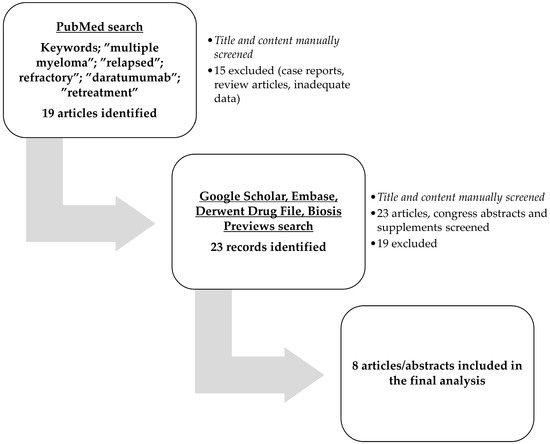 For this systematic review eligible articles were searched in PubMed using the keywords: “multiple myeloma” AND “relapsed” OR “refractory” AND “daratumumab” AND “retreatment” OR “re-treated” OR “retreated” OR “re-treatment”. Other databases searched were Google Scholar, Embase, Biosis Previews, and Derwent Drug File. All articles were manually checked for content, and eight articles were ultimately included in this review. All articles were published in English, and conference reports were not discarded. The literature search was conducted in June 2024. Article selection followed the recommendations of the Preferred Reporting Items for Systematic Reviews and Meta-analyses (PRISMA) (Supplementary Materials File S1). The study flowchart is illustrated in Figure 1.