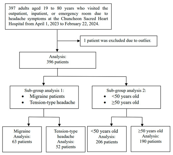This study is a secondary analysis study using collected data from a previous research project registered in the Korean Clinical Trial Database. The information can be verified at the following URL: https://cris.nih.go.kr/cris/index/index.do (Study ID: KCT0008684; accessed on 22 October 2024). In the original project, the inclusion criteria encompassed adult men and women aged 19 to 80 seeking treatment for all types of headaches at the Chuncheon Sacred Heart Hospital in Chuncheon, South Korea, between 1 April 2023 and 22 February 2024, including both outpatients and inpatients, as well as emergency room patients. The causes of headaches included migraine, TTH, headache of vascular, infection, inflammation, or trauma origin (Table 1).