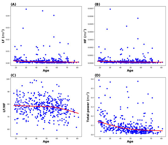 Association between age and the heart rate variability factors. Blue dots represent the scatterplot of age and the HRV factors (LF, HF, LF/HF, and TP). The red line is the LOESS line. (A) Association between age and LF, (B) association between age and HF, (C) association between age and the LF/HF ratio, (D) association between age and TP. HF, high frequency; LF, low frequency.