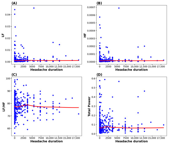 Association between the heart rate variability factors and headache duration. Blue dots represent the scatterplot of headache duration and the HRV factors (LF, HF, LF/HF, and TP). The red line is the LOESS line. (A) Association between headache duration and LF, (B) association between headache duration and HF, (C) association between headache duration and the LF/HF ratio, (D) association between headache duration and TP. HF, high frequency; LF, low frequency.