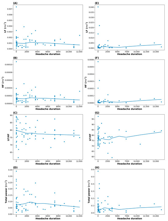 Association between HRV-related indices and headache duration in migraine and tension-type headache. Blue dots are scatterplots of headache duration and HRV-related indices. The blue line is the LOESS line. (A) Association between headache duration and LF in migraine; (B) association between headache duration and HF in migraine; (C) association between headache duration and the LF/HF ratio in migraine; (D) association between headache duration and TP in migraine; (E) association between headache duration and LF in TTH; (F) association between headache duration and HF in TTH; (G) association between headache duration and the LF/HF ratio in TTH; (H) association between headache duration and TP in TTH. HF, high frequency; HRV, heart rate variability; LF, low frequency.