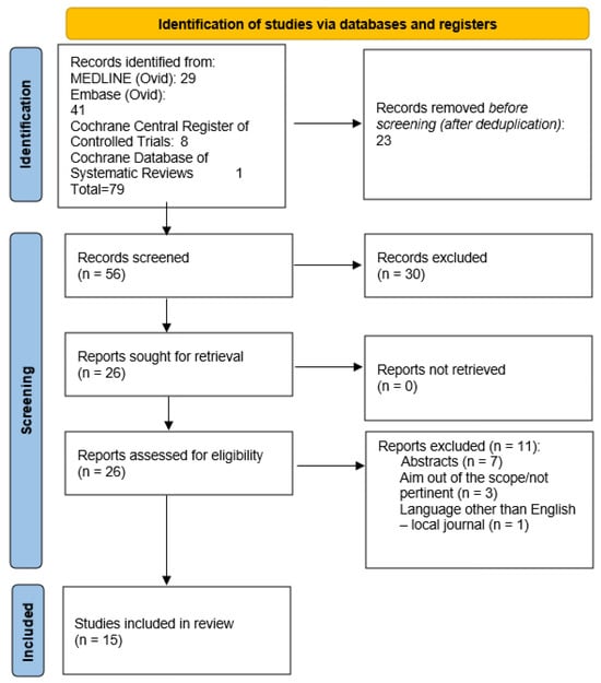 A total of 79 articles were identified. Following the removal of duplicates and screening of abstracts, 56 articles remained. Subsequently, a comprehensive full-text review of 26 articles was conducted. Ultimately, 15 articles met the predefined inclusion criteria (Appendix B). All the studies evaluated the efficacy of MLT in primary open-angle glaucoma (POAG), pseudoexfoliative glaucoma (PXG), and ocular hypertension (OHT). Across various study designs, MLT consistently demonstrated a significant reduction in IOP. Adverse events associated with MLT were generally mild and transient, including intraocular inflammation, transient IOP spikes, and corneal epithelial defects. Long-term follow-up data on the durability of IOP reduction post-MLT are limited but suggest sustained efficacy over months to years. Figure 1 summarizes the research approach applied in this systematic review within a flowchart.