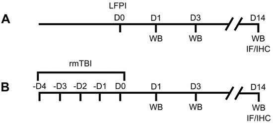 Experimental procedure timelines of mice subjected to (A) single moderate lateral fluid percussion injury (LFPI) or (B) repetitive mild traumatic brain injury (rmTBI). Animals belonging to the LFPI or rmTBI group were sacrificed 1, 3 or 14 days after the experimental protocol. Sham control mice of the LFPI or rmTBI group were euthanized on day 1 after the experimental protocol. Separate cohorts of mice were used for Western blotting (WB) and immunofluorescent/immunohistochemical analyses (IF/IHC). D: day.