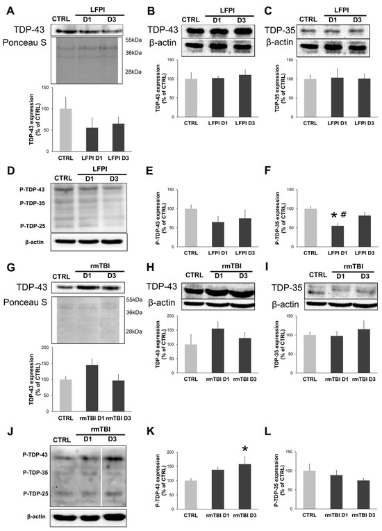 Next, we wanted to determine if a single moderate or repetitive mild TBI could induce acute post-translational modifications of cytoplasmic TDP-43 in comparison to their corresponding brain trauma controls, as shown in Figure 2D,J. The Western blot analyses, performed with specific anti-phospho(409/410)-TDP-43 antibody, detected a significant decrease in phosphorylated TDP-35 fragment (P-TDP-35) expression on day 1 after single brain trauma (Figure 2F) [F(2,7) = 8.933; p = 0.012] compared to the animals of the control group (p = 0.004) and animals sacrificed 3 days after moderate LFPI (p = 0.034). Single brain trauma did not affect protein levels of phosphorylated TDP-43 (P-TDP-43) (Figure 2E) acutely. In contrast to that, repetitive mild TBIs increased P-TDP-43 (Figure 2K) protein levels on day 3 [F(2,9) = 3.016; p = 0.046] in comparison to the related control group. Densitometric analyses did not detect acute changes in the P-TDP-35 expression levels (Figure 2L) after rmTBI.