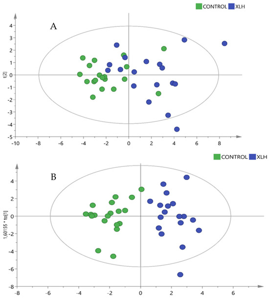 PCA score plot (A) and OPLS-DA score plot (B) illustrating the separation of metabolomic profiles between controls and XLH patients. Model validity and robustness were assessed using R2(Y) for goodness-of-fit and Q2(Y) for predictive accuracy, with Q2(Y) > 0.5 indicating acceptable predictive performance. R2 = 0.744, Q2 = 0.528.