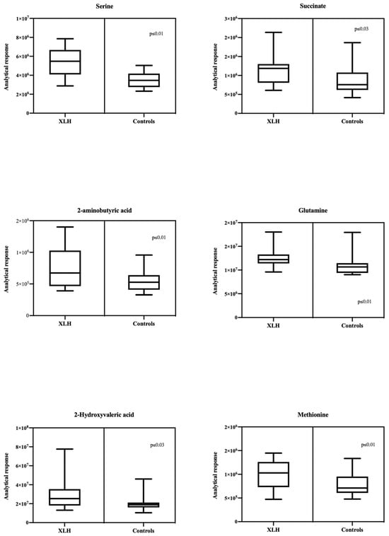 Box and whisker plots representing the relative intensities of the metabolites with statistical differences between XLH patients and controls.