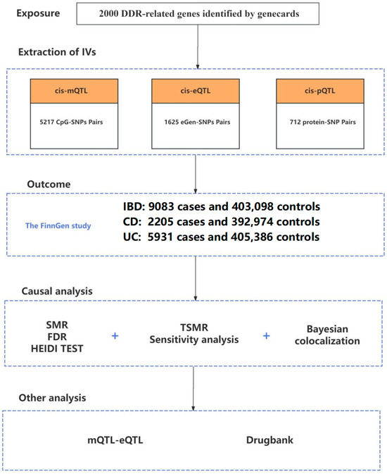 Here, we first investigated potential causal associations between DDR gene expression, DNA methylation, and protein expression levels in IBD utilizing SMR or TSMR. Subsequently, we integrated multi-omic data between mQTL and eQTL to reveal potential regulatory mechanisms of risk variants on IBD. Finally, we evaluated the potential druggability of the identified DDR genes.