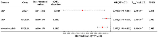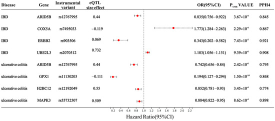 After conducting SMR analysis, we identified a significant association between the expression of 1625 DDR-related genes and IBD (Figure 1). An uncorrected p-value can result in a substantial number of false positives, erroneously identifying associations. By employing FDR correction, we adjusted the p-value to effectively control the false positive rate, ensuring enhanced reliability of the identified significant associations. An FDR-adjusted p-value < 0.1 signifies compelling evidence of an association. At the same time, when PHEIDI > 0.05, it indicates that these associations are not caused by pleiotropy. To further mitigate confounding arising from linkage disequilibrium (LD), we conducted a colocalization analysis. A PPH4 value exceeding 0.70 provides robust support for a shared causal variant between eQTL and IBD GWAS. After multiple testing corrections, a HEIDI test, and colocalization analyses, the genetic predictions of Cox5a expression were observed to be significantly associated with an increased risk of IBD (OR 1.773, 95% CI 1.284–2.263; PPH4 = 0.867). Similarly, a strong association was detected between Ube2l3 expression and IBD susceptibility (OR 1.103, 95% CI 1.056–1.151; PPH4 = 0.908). Meanwhile, Arid5b (OR 0.835, 95% CI 0.756–0.922; PPH4 = 0.845) and Erbb2 (OR 0.343, 95% CI 0.202–0.582; PPH4 = 0.921) expression could decrease the IBD risk. For UC, a genetically predicted increase in one SD in Arid5b (OR 0.742, 95% CI 0.656–0.84; PPH4 = 0.795), Gpx1 (OR 0.19, 95% CI 0.127–0.294; PPH4 = 0.868), H2bc12 (OR 0.852, 95% CI 0.781–0.93; PPH4 = 0.774), and Mapk3 (OR 0.884, 95% CI 0.822–0.95; PPH4 = 0.898) expression could decrease the risk (Figure 2 and Table S3).