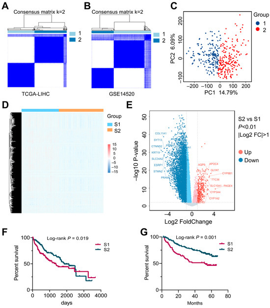 Identification of HCC subtypes. (A) Heatmap of the consensus matrix for two clusters in TCGA-LIHC (k = 2). (B) Heatmap of the consensus matrix for two clusters in GSE14520 (k = 2). (C) Principal component analysis (PCA) of two subtypes. (D) Clustering heatmap of S1 and S2 subtypes. (E) Differentially expressed genes between S1 and S2 subtypes. (F,G) K-M survival analysis of S1 and S2 subtypes based on OS (log-rank test) in the TCGA training cohort (F) and GSE14520 validation cohort (G). p-values were determined using Student’s t-test and the Wilcoxon test.
