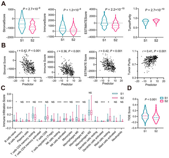 Immune microenvironment characteristics in S1 and S2 subtypes. (A,B) Stromal score, immune score, ESTIMATE score, and tumor purity (A) and their correlation with the subtype predictor (B). (C) Immune cell infiltration characteristics of two subgroups. (D) TIDE scores of S1 and S2 subtypes. p-values were determined via Student’s t-test and the Wilcoxon test; correlation analysis was performed via Spearman analysis.