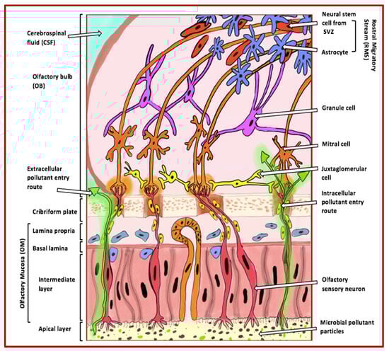 Extracellular and intracellular entry routes via the olfactory mucosa for pollutants into the brain. The figure illustrates how pollutants can enter the brain through extracellular and intracellular routes via the olfactory mucosa. These pollutants, indicated by green arrows, become trapped in the apical layer cilia and can enter the olfactory bulb through the axons of olfactory sensory neurons. Once inside the bulb, the pollutants can move towards and accumulate in higher cognitive areas that are commonly affected in AD. The various cell types of the olfactory bulb that are involved in odour perception include the following: (i) granule cells, which adjust and fine-tune olfactory signals within the olfactory bulb; (ii) mitral cells, the primary projection neurons responsible for conveying processed odour signals to the olfactory cortex; (iii) juxtaglomerular cells, a collection of interneurons that manage activities in glomeruli, assisting in odour differentiation and contrast amplification; (iv) neural stem cells from the rostral migratory stream, which contribute to the continuous replenishment of interneurons; and (v) astrocytes, which provide structural, metabolic, and trophic support to neurons and help maintain the extracellular environment within the olfactory system. Abbreviations: SVZ (subventricular zone).