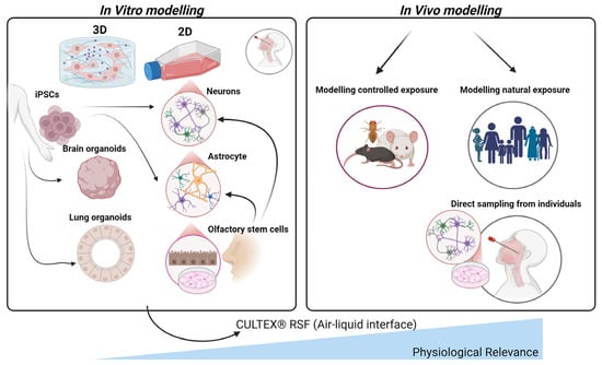 Comparative in vitro and in vivo models for studying air pollution impacts on the olfactory system. This figure illustrates various in vitro (left) and in vivo (right) approaches to model the effects of air pollution on olfactory tissues. In vitro models, derived from induced pluripotent stem cells (iPSCs), include 2D and 3D cultures such as brain and lung organoids, neurons, astrocytes, and olfactory stem cells, providing controlled environments to study specific cellular responses. As such, lung organoids provide a valuable platform for studying the impact of air-pollution-induced systemic inflammation and oxidative stress, mechanisms that can propagate through the circulatory system and olfactory pathways to the brain, contributing to neuroinflammation and the pathogenesis of AD. The CULTEX® Radial Flow System (RFS) is highlighted for its air–liquid interface, which mimics physiological conditions by allowing direct pollutant exposure to cultured cells. In vivo models comprise controlled exposure studies in animals and natural exposure assessments in human populations, including direct sampling from individuals’ nasal tissues. Together, these models support a comprehensive understanding of air pollution’s effects on the olfactory system and its potential contributions to neurodegenerative disease development.
