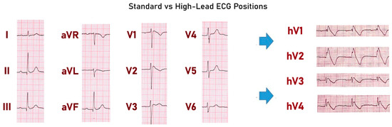 Comparison between standard chest electrode placement and high-lead placement in patients with BrS. (Left): Standard precordial lead placement, with V1 and V2 positioned in the fourth intercostal space. (Right): High-lead placement to enhance diagnostic sensitivity in Brugada Syndrome. In this configuration, V1 and V2 are shifted to the second or third intercostal space, remaining parasternal, while V3 and V4 are similarly elevated to corresponding higher positions along the chest.