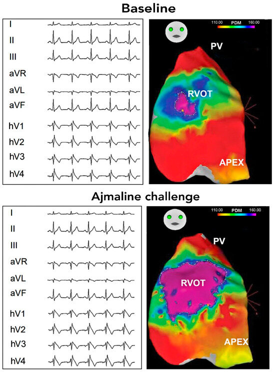 Epicardial electroanatomic mapping of a patient with Brugada syndrome, comparing baseline conditions with the effects of ajmaline administration. On the left, the surface ECG leads (I, II, III, aVR, aVL, aVF, hV1–hV4) demonstrate the transformation induced by ajmaline, with the emergence of a coved-type ST-segment elevation. On the right, the electroanatomic maps display the distribution of epicardial potentials, color-coded by bipolar voltage amplitude (PDM range: 110–160). Under baseline conditions, a localized region of fractionated, low-voltage electrograms is observed near the right ventricular outflow tract (RVOT). Following the ajmaline challenge, this area expands significantly, with a prominent enlargement of the low-voltage zone, corresponding to the arrhythmogenic substrate, extending to the pulmonary valve (PV).