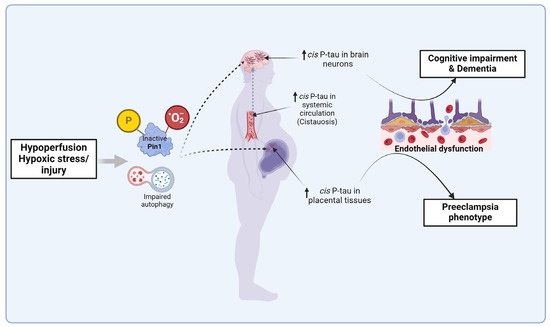 There is growing evidence that preE is an example of a non-neuronal disease-associated Pin1 inactivation by oxidation and phosphorylation, and concomitant intracellular accumulation of pathogenic cis P-tau aggregates that could leak into the circulation after attaining a specific critical threshold [49], in line with general protein misfolding, aggregation and aberrant/incomplete degradation (proteolysis) mechanisms [81,249,250,251,252]. The toxic cis P-tau inhibits trophoblast endovascular invasion of the decidua [49,188]. Hence, spiral artery remodeling is compromised [188], leading to poor blood flow to the intervillous space, placental ischemia and hypoxia, and STB stress (stage 1 of preE), which precipitates the maternal clinical features of preE (stage 2) [1,81,253,254]. STB stress (stage 1) is characterized by endoplasmic reticulum (ER) stress, oxidative stress, mitochondrial damage, dysregulated metabolism, and apoptosis [253,255,256]. The stressed STB releases pro-inflammatory cytokines, reactive oxygen species, sFlt-1, sEng, cell-free fetal DNA, and extracellular vesicles (EVs) with specific cargo that can induce the pathobiological changes in other cells by paracrine signaling [1,253,254,257,258,259], and plausibly misfolded (aggregated) proteins including cis P-tau [81] into the maternal circulation. These factors disrupt maternal endothelial function and promote systemic multi-end-organ damage that involves reduced vasodilation, generalized excessive vascular inflammation, and thrombosis (stage 2) [81,253,260,261,262]. The resultant effects include hypertension, liver and renal impairment, proteinuria, pulmonary edema, thrombocytopenia and coagulopathy [1,253], visual disturbances, persistent headache, stroke, and eclampsia (seizures) [263]. This cascade of events and the resultant phenotype are similar to the pathophysiology of VCID, including AD, where tissue hypoxia and oxidative stress induced by reduced CBF and increased BBB permeability stimulate toxic cis P-tau and other tau epitopes aggregation [41,44,191,192,193] and neuroinflammation that damage the neurovascular units leading to progressive neuronal axon, myelin, and endothelial cell degeneration [124,264,265,266]. A similar vascular dysfunction-hypoxia-induced tauopathy and tau-mediated toxicity is seen in carriers of certain ApoE isoforms (especially ApoE4) that cause dyslipidemia and impaired autophagy in the brain [94,96,101,102] and possibly in the placenta [239,240,267]. Although the cells exist at different body sites (placental tissues vs. brain neurons), the shared pathology is impaired autophagy, Pin1 inactivation, cis P-tau aggregation, cis P-tau-induced endothelial cell damage, and microtubule disassembly [49,96].