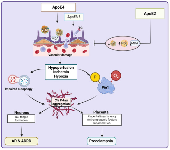 We hypothesize that carrying ApoE2 or ApoE3 is safer than not having ApoE or carrying ApoE4. In brain tissues, ApoE4 induces dyslipidemia leading to vascular dysfunction, reduced CBF, ischemia, hypoxia, inhibited autophagy, and may inactivate Pin1 (Figure 4). This can eventually lead to accumulation of toxic P-tau aggregates that are associated with AD and dementia. Though not resolved in placental tissues yet, ApoE4 or absence of ApoE can induce similar vascular dysfunction-hypoxia-mediated tauopathy associated with preE (Figure 4). The ApoE polymorphic link between preE and AD may be mediated by the protective action of ApoE2 common to both conditions, albeit driven by different mechanisms. Further investigation is warranted to clarify whether ApoE2 is associated with reduced aggregation of P-tau in serum or placenta of preE patients. In this regard, the actions of the different proteins associated with preE and dementia are summarized in Table 1.