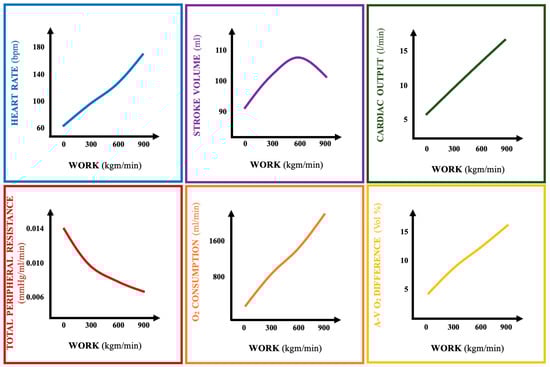 The changes in heart rate, stroke volume, cardiac output, total peripheral resistance, oxygen consumption, and arteriovenous O2 difference in relation to the amount of work performed are summarized in Figure 2.