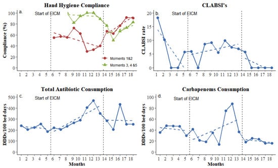 The methodology of an interrupted time series was used to assess the impact of EICM on hand hygiene, the CLABSI ratio, and antimicrobial as well as carbapenem consumption. There were 5, 8, and 5 time points for each outcome (except for hand hygiene compliance) during the three study phases (baseline, intervention, and maintenance). Actual data and trend lines were used for the visualization of differences. The linear regression model (LRM) was used for the comparison of different phases (for each LRM, we used one predictor for the time and two predictors per intervention). Fisher’s exact test was used to compare AMR gene detection using a targeted endpoint PCR approach vs. a culture-based technique.