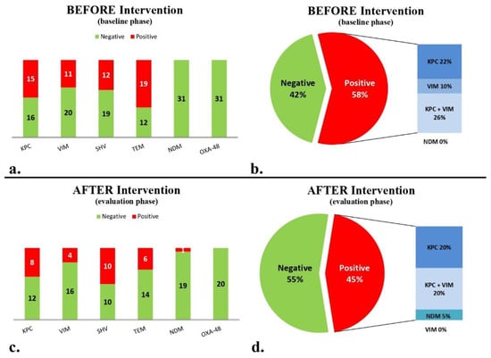 Presence/absence of carbapenemase and other β-lactamase genes of blaKPC, blaVIM, blaNDM, blaOXA-48-like, blaTEM and blaSHV: (a) before intervention; (b) negative and positive patients with the presence of at least one carbapenemase before intervention; (c) after intervention; and (d) negative and positive patients for the presence of at least one carbapenemase gene after intervention.