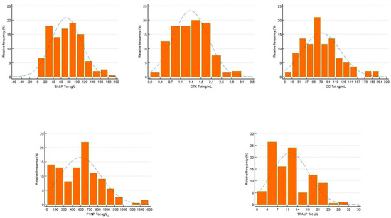 A total of 202 samples were considered evaluable, according to CLSI C28-A3, which indicates a minimum number of 120 objects to be included in studies for the evaluation of reference interval (RI). A descriptive statistical analysis of the distribution of the samples after the exclusion of the outlier values is reported in Table 1. In the group of subjects evaluated, 104 (51.48%) individuals were male and 98 (48.52%) were female. All samples evaluated had concentrations above the LoD. The distribution of biomarkers evaluated with the D’Agostino–Pearson test was non-normal (p is less than 0.05). The data obtained were confirmed by the analysis of frequency distribution histogram (%) and visual comparison of the observed frequency distribution with the underlying theoretical normality curve (Figure 1). The boxplots of the samples selected for the statistical evaluation did not highlight the presence of suspected outliers (Figure 2). The data obtained from the weighted polynomial regression are reported in Table 2.