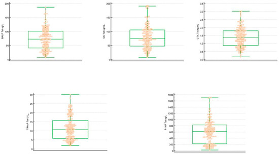 BALP is an enzyme active at an alkaline pH level that participates in the growth of hydroxyapatite crystals through the hydrolysis of pyridoxal phosphate (inhibitor of hydroxyapatite formation) [24]. BALP activity is pathologically increased in processes involving high osteoblastic activity [25] and is commonly referred to as a non-collagenous bone formation biomarker. There are several commercially available methods for measuring the mass and activity of bone ALP (BALP) [26,27,28,29,30]. Immunoassays are best suited for use in a clinical laboratory because they use BALP-specific monoclonal antibodies, are rapid to perform, easy to use, and provide reproducible data. For our study, an immunoassay reporting the mass of the enzyme was used; the method has a reportable range between 1 and 75 μg/L. The limit of detection (LoD) is 0.4 μg/L, the limit of quantification (LoQ) is 1.0 μg/L; Intralaboratory analytical CV (%) were comparable with those reported in the literature [31,32,33,34,35,36] and with those reported by the manufacturer [intra-assay CV (%) from 2.0% to 5.1%, total CV (%) from 6.6% to 9.0%].