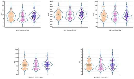 The violin plots of BALP (ug/L), CTX (ng/mL), OC (ng/mL), PINP (ug/L), and TRAcP (U/L) concentration in total (orange dots), in females (violet dots), and in males (blue dots). The median value (red dot) and CI of the median (green lines) are drawn inside the violin graph.