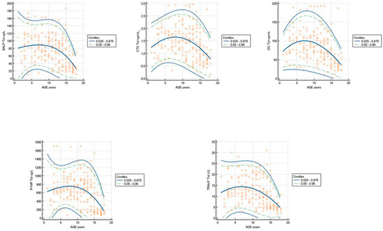 PINP: The data obtained from the weighted polynomial regression and reported in Table 2 highlight that the age group of 2 years presents the highest degree of dispersion with a difference equal to 1217.92 μg/L and the highest concentration value 1267.89 ug/L. The age group 16 years showed the lowest dispersion of values with a concentration difference of 824.77 μg/L. The lowest concentration at 0.05 centiles of 40.78 μg/L and at 0.95 centiles of 865.69 μg/L was found in the group of pediatric subjects at 14–15 years and 16–18 years, respectively.