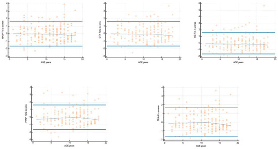 OC: The data obtained from the weighted polynomial regression and reported in Table 2 highlight that the age group of 8 years presents the highest degree of dispersion with a difference equal to 134.02 ng/mL and the highest concentration value 167.08 ng/mL at 0.95 centiles. The age group 16 years showed the lowest dispersion of values with a concentration difference of 93.48 ng/mL, with the lowest concentrations at 0.05 centiles and 0.95 centiles of 8.72 and 102.2 ng/mL. The graph of the dispersion of the measurements did not highlight an apparent different distribution of the OC in the groups of subjects at age 1–12; the graph highlights a reduction in the concentration in the subgroup over 13 years of age (Figure 4). The z-scores showed a decline in the average distribution line starting from subjects aged 13 years. The percentage of cases included between the acceptance lines corresponding to z = +/−1.645 was less than 5% (Figure 5).
