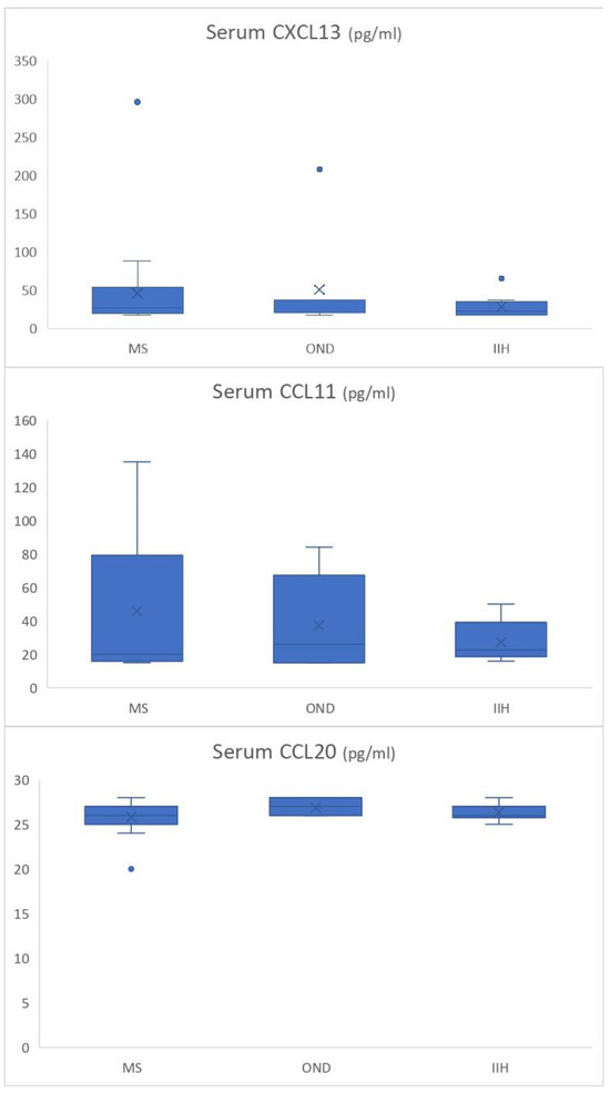 The box plots illustrate baseline serum CXCL13, CCL11, and CCL20 levels (pg/mL = picograms/milliliter) in MS (n = 23), IIH (n = 10), and OND (n = 7) groups.